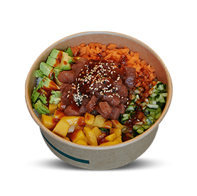 Saumon mariné, mangue, avocat, choux rouges, edamame.