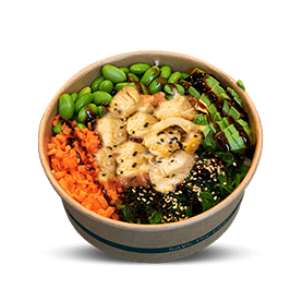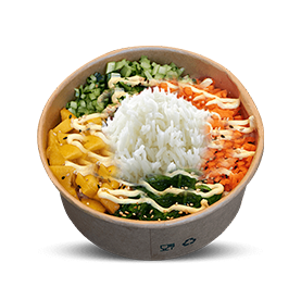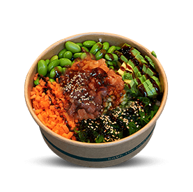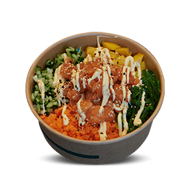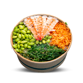 Concombre, carotte râpée, avocat, crevettes, edamame, choux rouges, ananas, sauce harrachi.